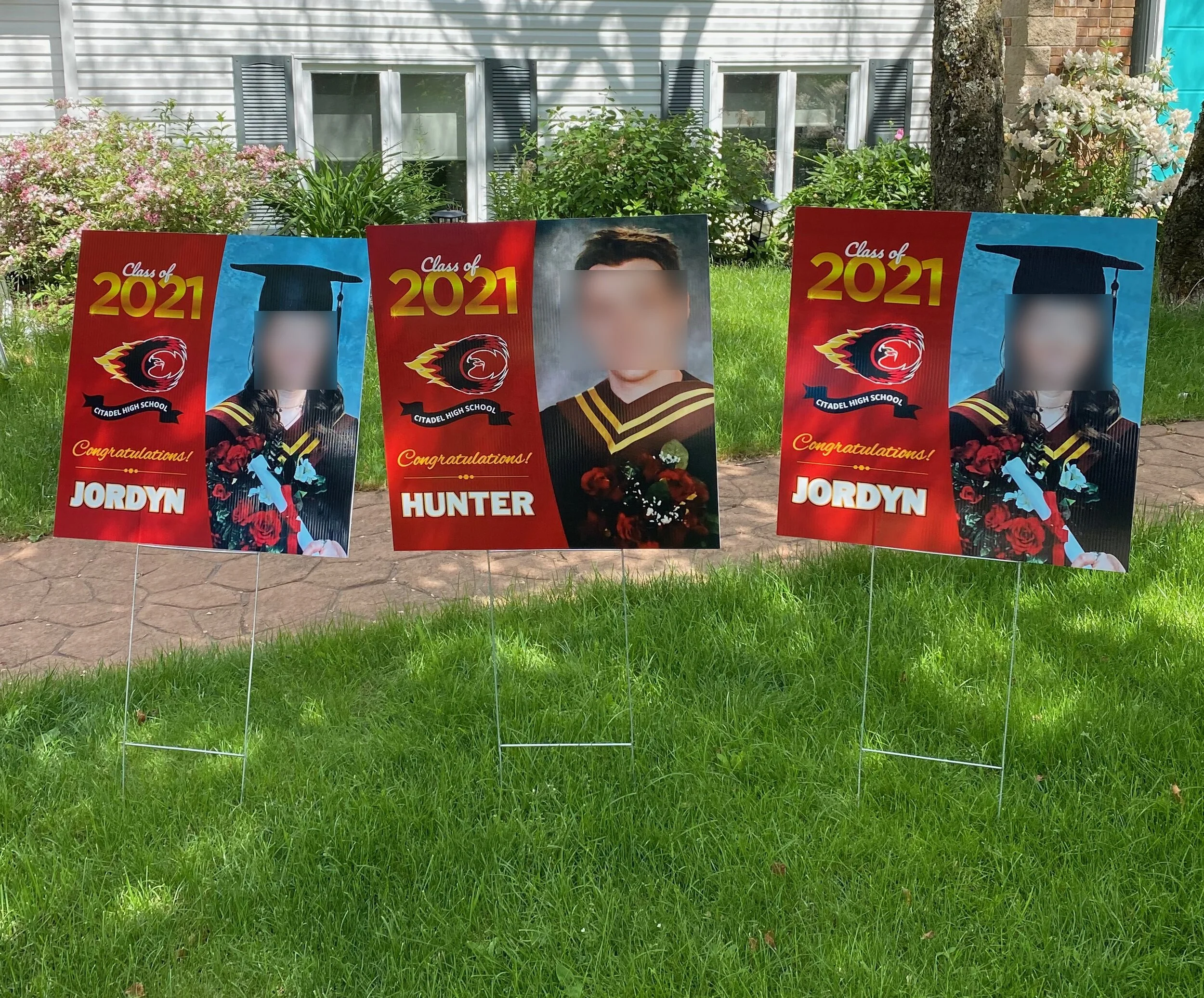 Custom lawn signs for Graduation. Signs are 24” X 24” and designed to your specs using your school colours and logo, etc. Includes wire H frame for easy lawn placement. You provide the graduate’s name and photo, and name of school, we will do the rest. Note: you can add other messages to the sign also. Local HRM Pick-up ONLY. Email photo and particular info with receipt number to troy@atlanticchip.ca.